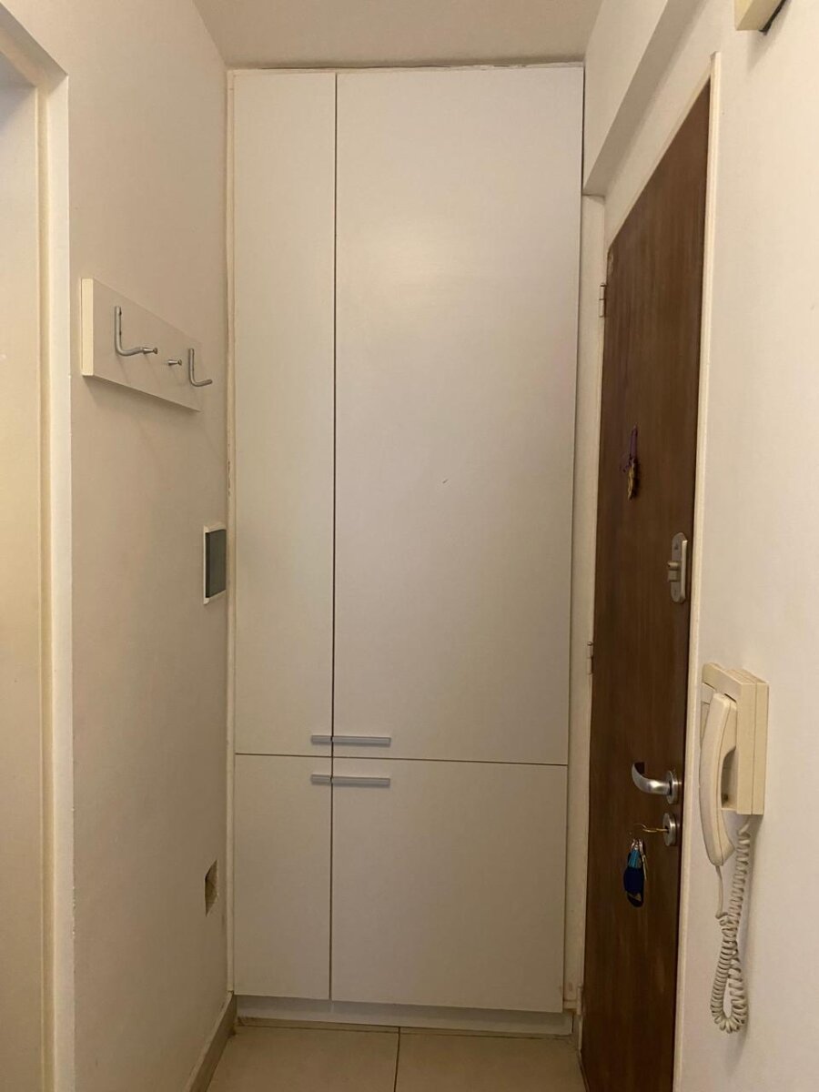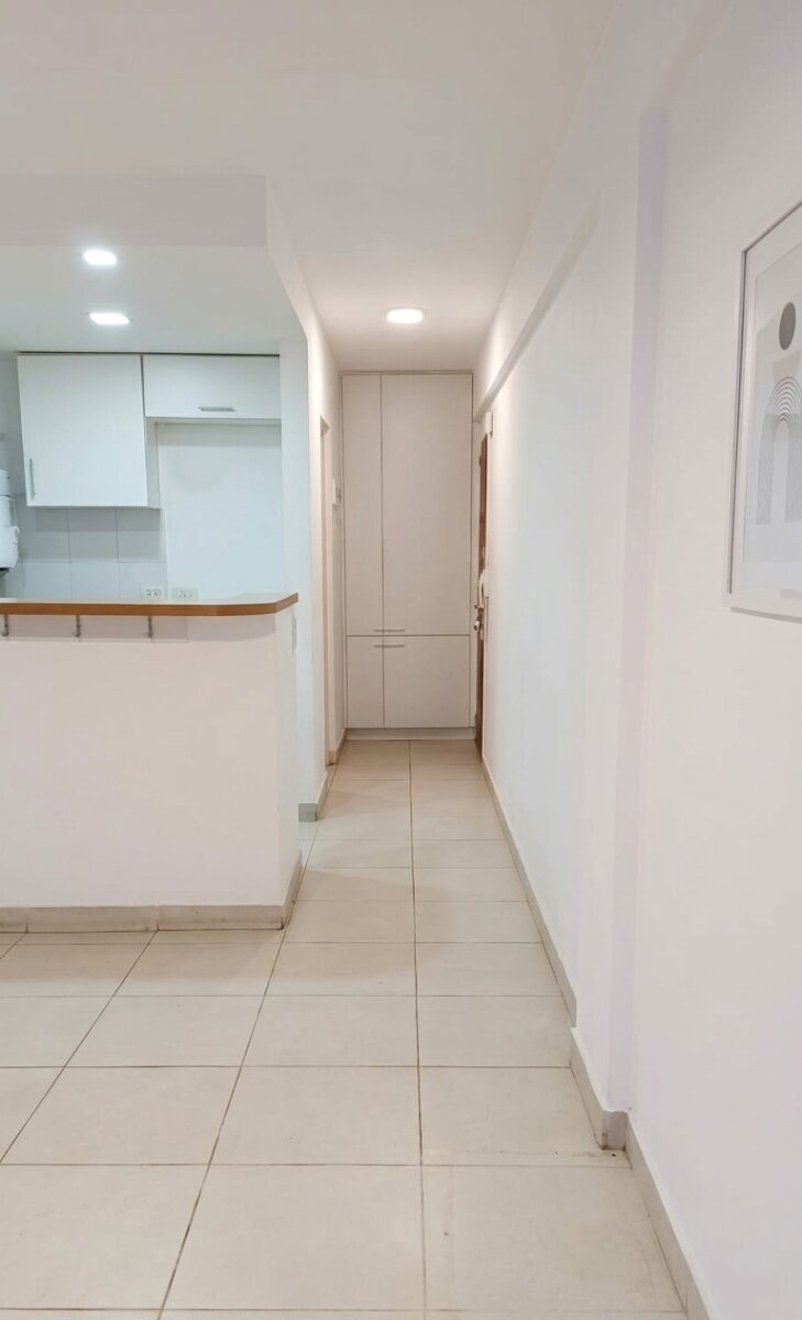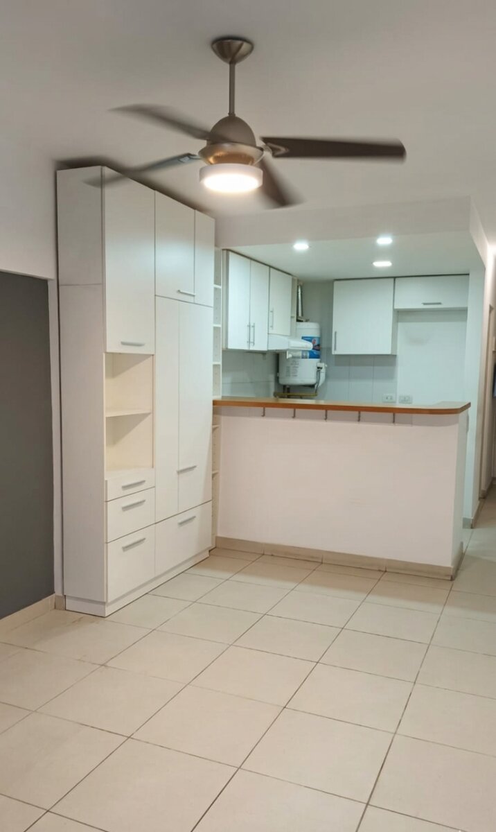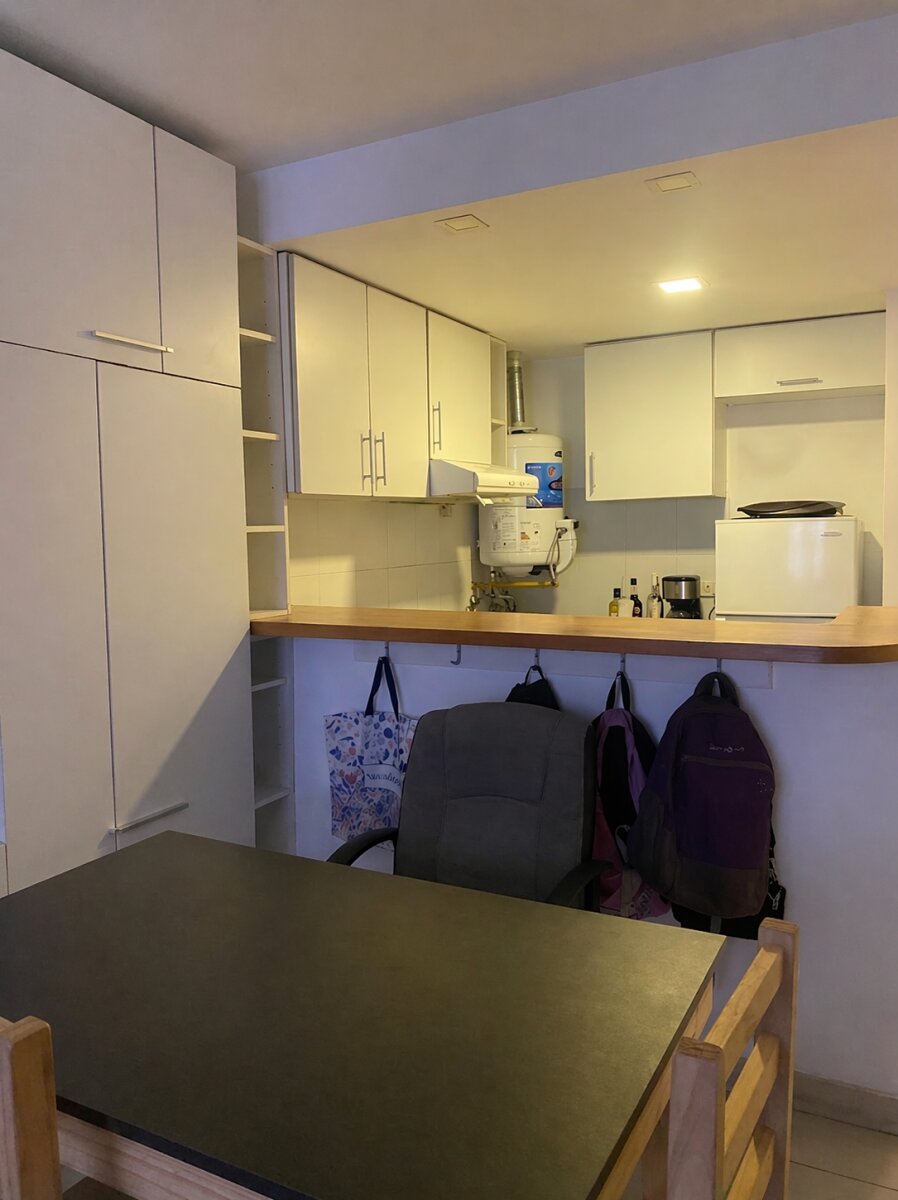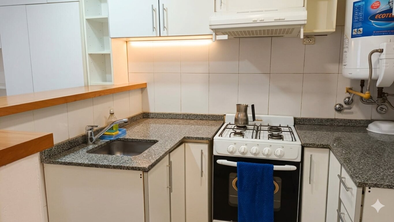 La cocina integrada con barra americana cuenta con mobiliario completo y se entrega equipada con termotanque, cocina y extractor. Incorpora además un mueble con espacio de guardado, baño completo y balcón, aportando ventilación y luz natural.